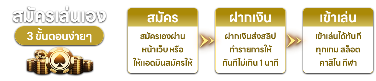 ตอบ : - เข้าเว็บไซต์หลัก กดปุ่มสมัครสมาชิก - กรอกข้อมูลส่วนตัวให้ครบถ้วน - ยืนยันเบอร์โทรศัพท์ผ่าน OTP - รับ Username และ Password - เริ่มเล่นได้ทันทีหลังฝากเงิน